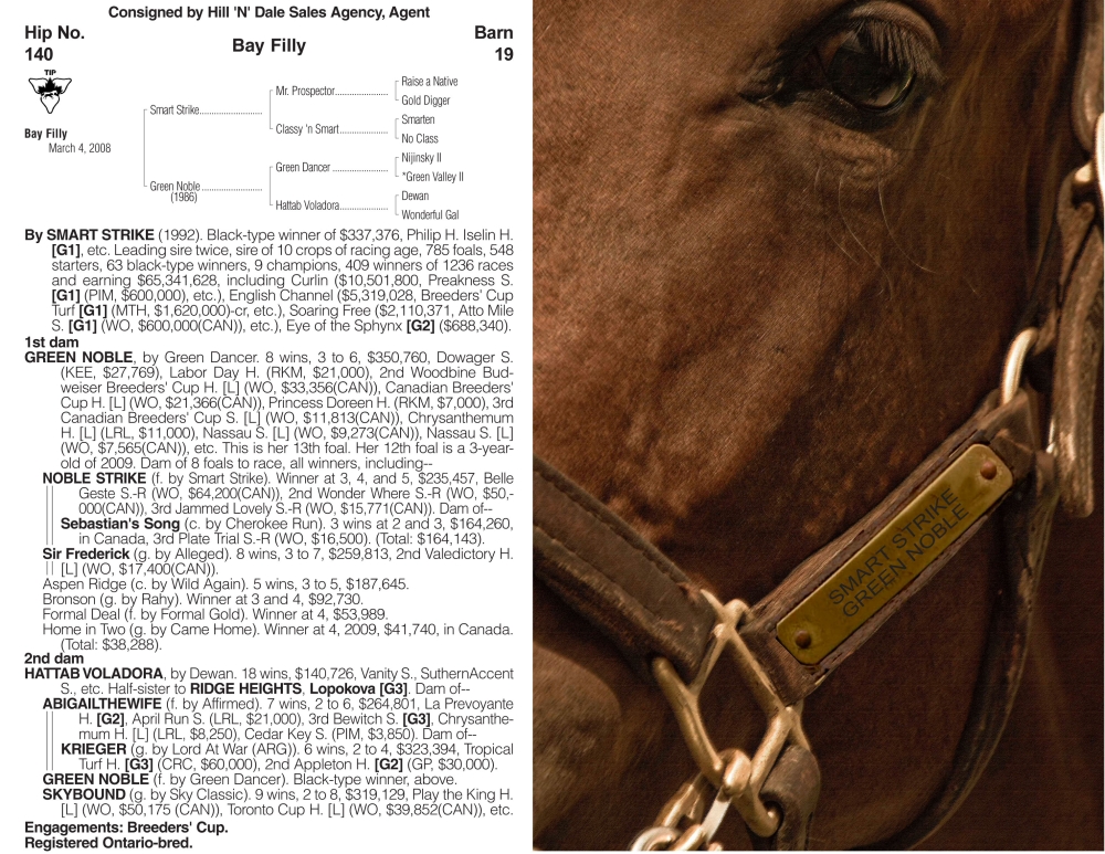 Hill ‘N’ Dale Canadian sales graduates read like a who’s who of Canadian racing. Included in this group are Horse of the Year - A BIT O GOLD, multiple Champion ONE FOR ROSE and G1 winners in both North America and Europe etc. In addition to the colt and filly featured below, Hill ‘N’ Dale will offer 59 other yearlings between the Selected and Open (9/12/09) yearling sales. An Inward Buyers Program, lucrative purses, world class facilities, an extremely accommodating sales staff etc. are among the reasons to attend.